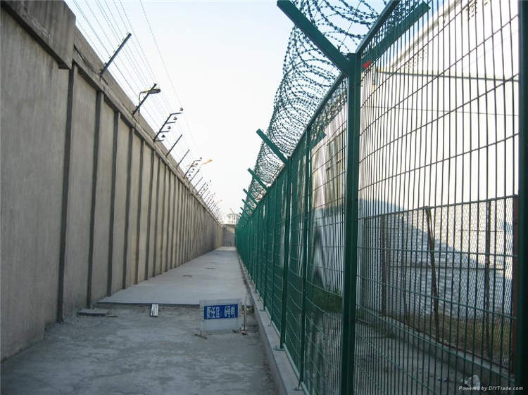 2:監獄鋼網墻用在放風場 警戒線內就需要做成2.5-5m左右的高度。上部加Y型柱,有效防止犯人的逃脫,因為上部會安裝刀片刺繩,對人也起到恐嚇的作用。其他特殊規格均可定做。我們會為您提供**好的使用方案。